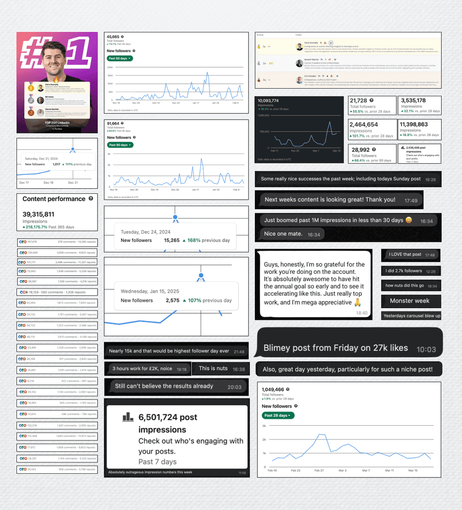 We are a founder-led personal branding agency that transforms executives and entrepreneurs into industry thought leaders. With over 500M impressions generated and $10M in client revenue driven through organic LinkedIn strategies, we help ambitious leaders build authority, attract opportunities, and scale their influence.